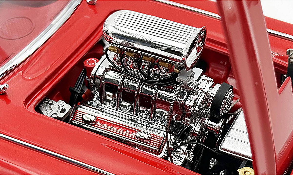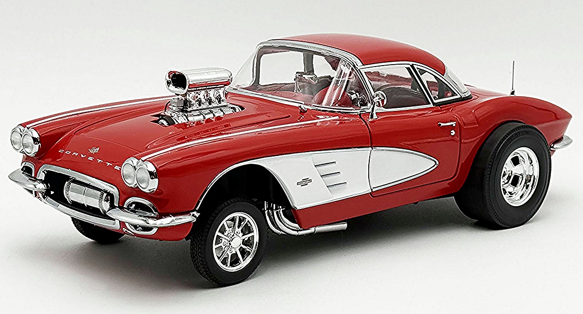 This wicked 1961 Chevrolet Corvette Gasser is decked out in a two-tone red and white paint scheme set on a set of drag style wheels and tires. Armed with a blown 238 Fuelie engine with custom headers gives this beauty all the power to take on any competitor. Open the doors to reveal a beautiful red interior with a detailed dashboard, seats and seat belts. Opening trunk and hood with a detailed chassis and poseable steering and so much more!
