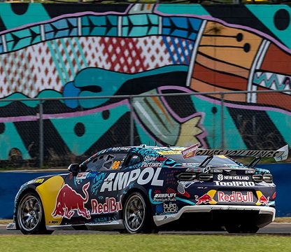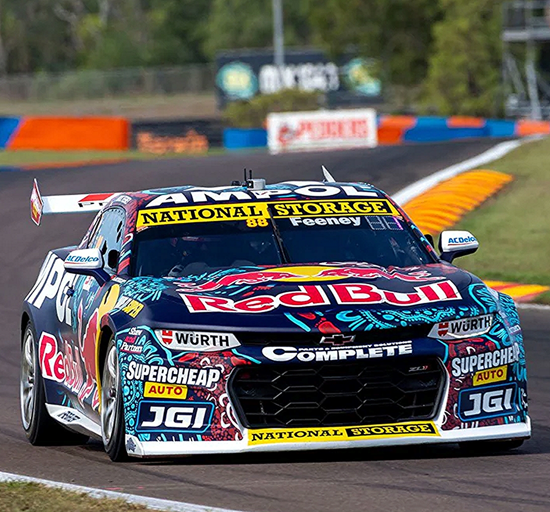 Adding to the significance, Feeney’s Camaro was adorned in Triple Eight Race Engineering’s 2025 Indigenous Round livery—a vibrant design rich with cultural meaning. Featuring detailed dot painting, the artwork tells a story of harmony between people, animals, and the land. Flowing blue dots represent creeks and waterholes, precious sources of life and knowledge. Red dots reflect the warmth of the earth and the deep spiritual connections shared across generations. At the heart of the design, a crocodile and a barramundi symbolise ancient elders, representing the guardians of wisdom, tradition, and the natural world.
