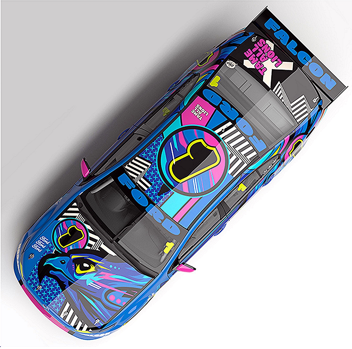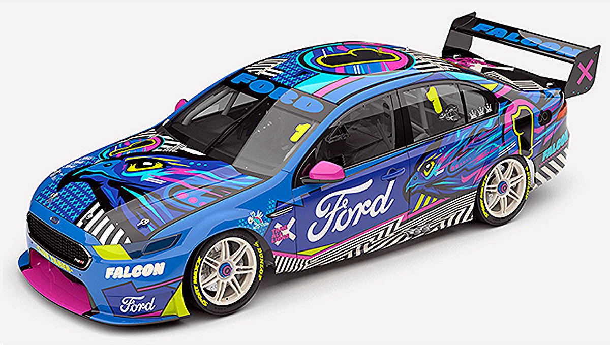 Seeing a stylised bird motif on the sides of a Falcon race car isn’t a new concept, but Tristan’s approach to this edition is. It features an incredibly striking Falcon illustration adorning the sides of the car and bonnet, a bold #1 design combined with patterns, vibrant colours and more over a blue, Ford branded base.