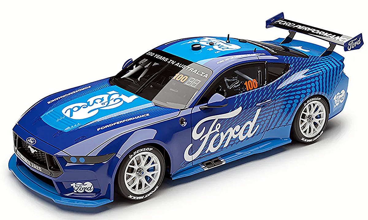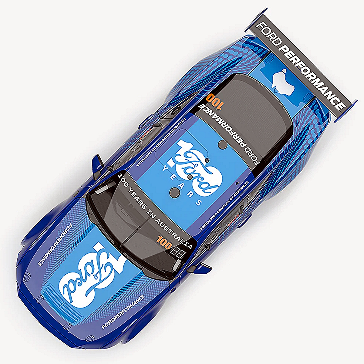 Featuring an incredible livery designed by Tristan Groves, the model showcases a striking blue Ford design, drawing inspiration from recent Ford-branded Mustang Supercars of the modern era. Prominent Ford 100 Years and Ford Performance branding adorn the livery, while the bold orange ‘100’ on the windows pays tribute to this iconic brand continuing to lead the pack Down Under.