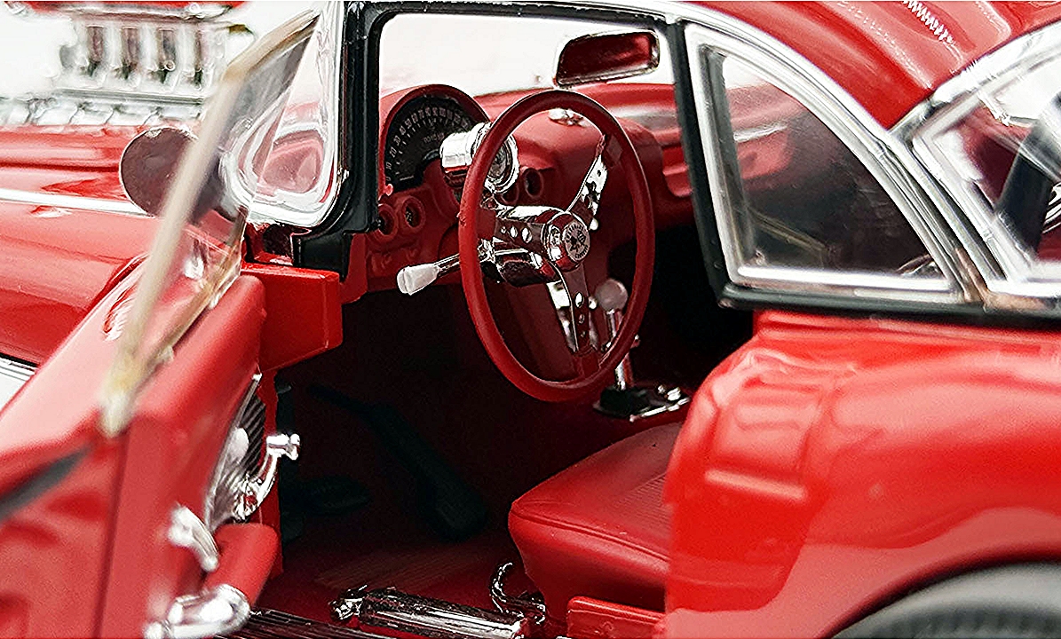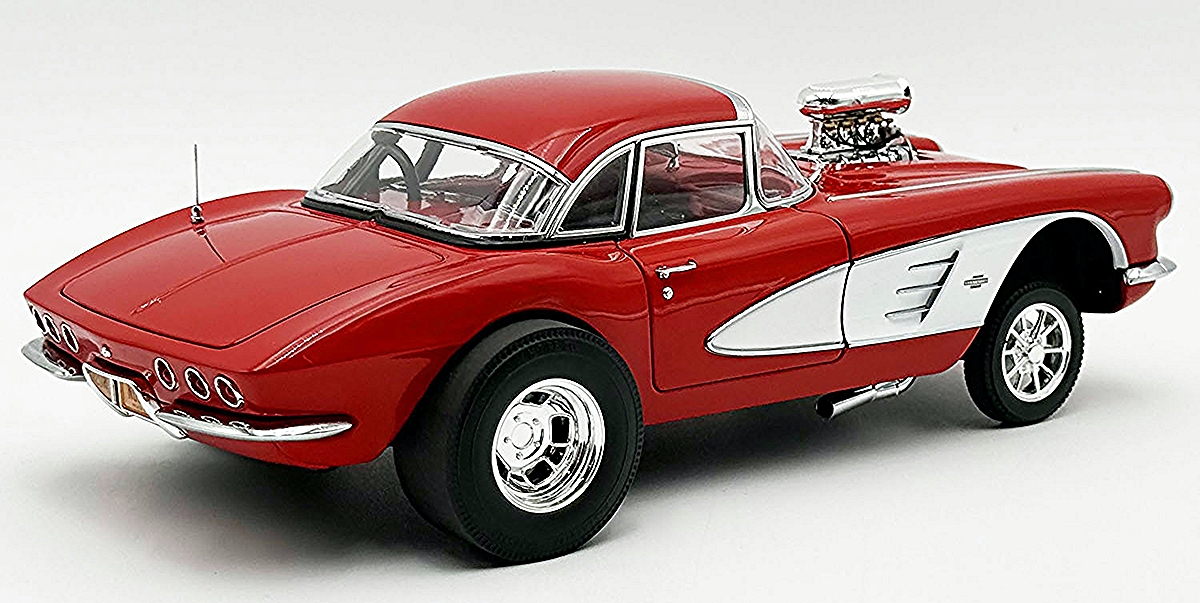 This wicked 1961 Chevrolet Corvette Gasser is decked out in a two-tone red and white paint scheme set on a set of drag style wheels and tires. Armed with a blown 238 Fuelie engine with custom headers gives this beauty all the power to take on any competitor. Open the doors to reveal a beautiful red interior with a detailed dashboard, seats and seat belts. Opening trunk and hood with a detailed chassis and poseable steering and so much more!