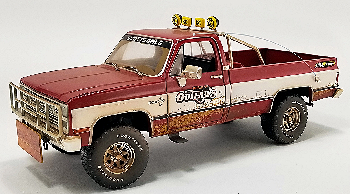 You asked for it, and we heard you! The World of Outlaws 1982 Chevrolet K-20 Push Truck is the perfect addition to your sprint car collection! The model has all the features you’d expect in a dirt track push truck! It starts with the custom weathered/ dirty exterior and large off-road wheels and tires. We then move to the roll bar with KC lights, CB antenna, lifted suspension, military brush guard and bumpers and the wood push block on the front bumper. Now you’re ready to get your diecast sprint car rolling for the A Main!!!