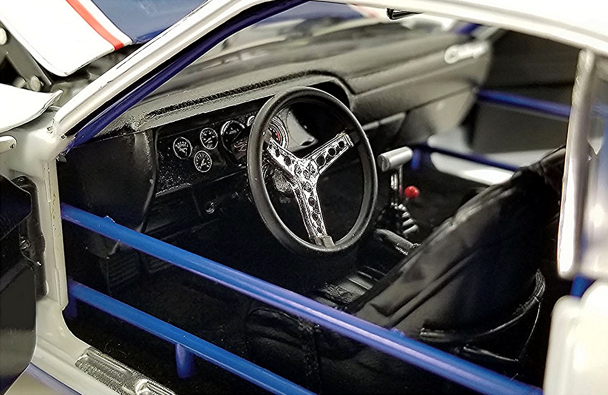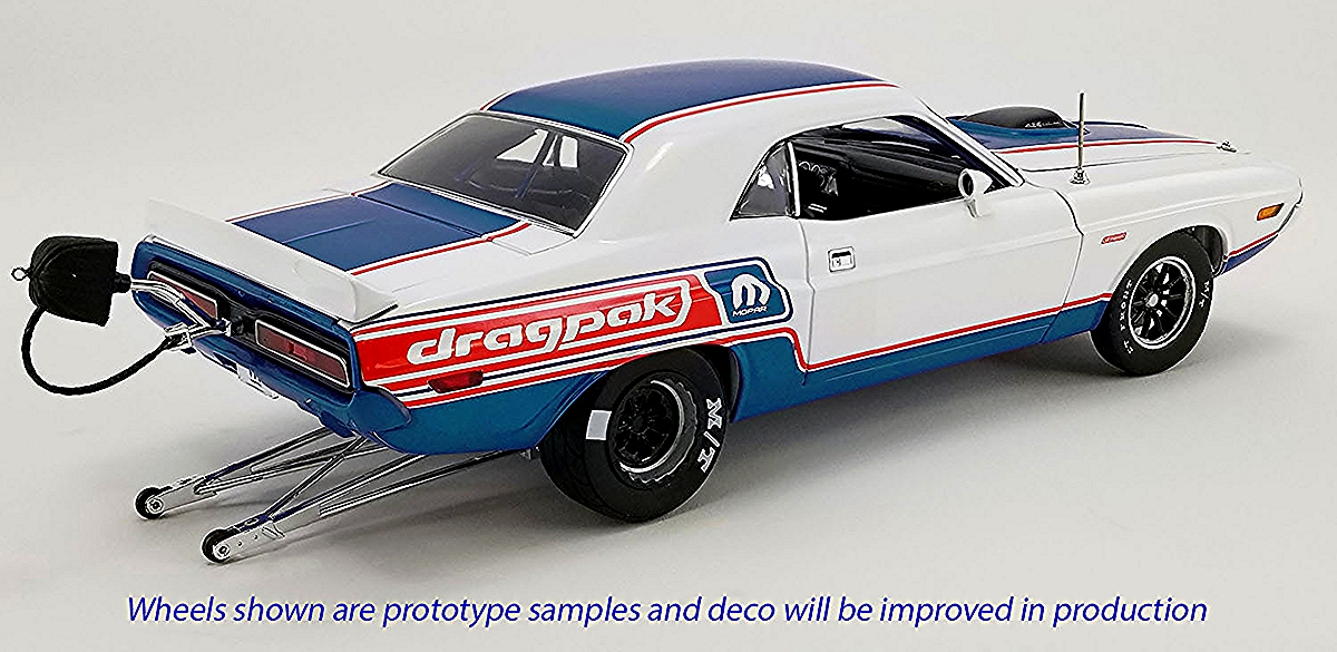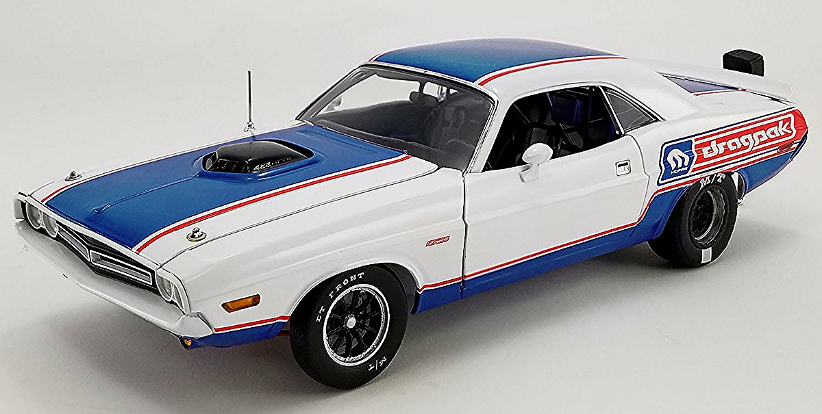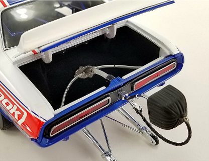 So, without further ado, ACME is pleased to present our 1971 Dodge Challenger R/T – MOPAR Drag Pak edition in celebration of Dodge’s all new 2021 Challenger MOPAR Drag Pak that is finished in an awesome white, red and blue paint scheme! In addition to the amazing decoration package, this model features a full roll cage, race seats, our all new Drag Outlaws drag wheels, drag tires, a fully plumbed and wired 426 HEMI and much much more!