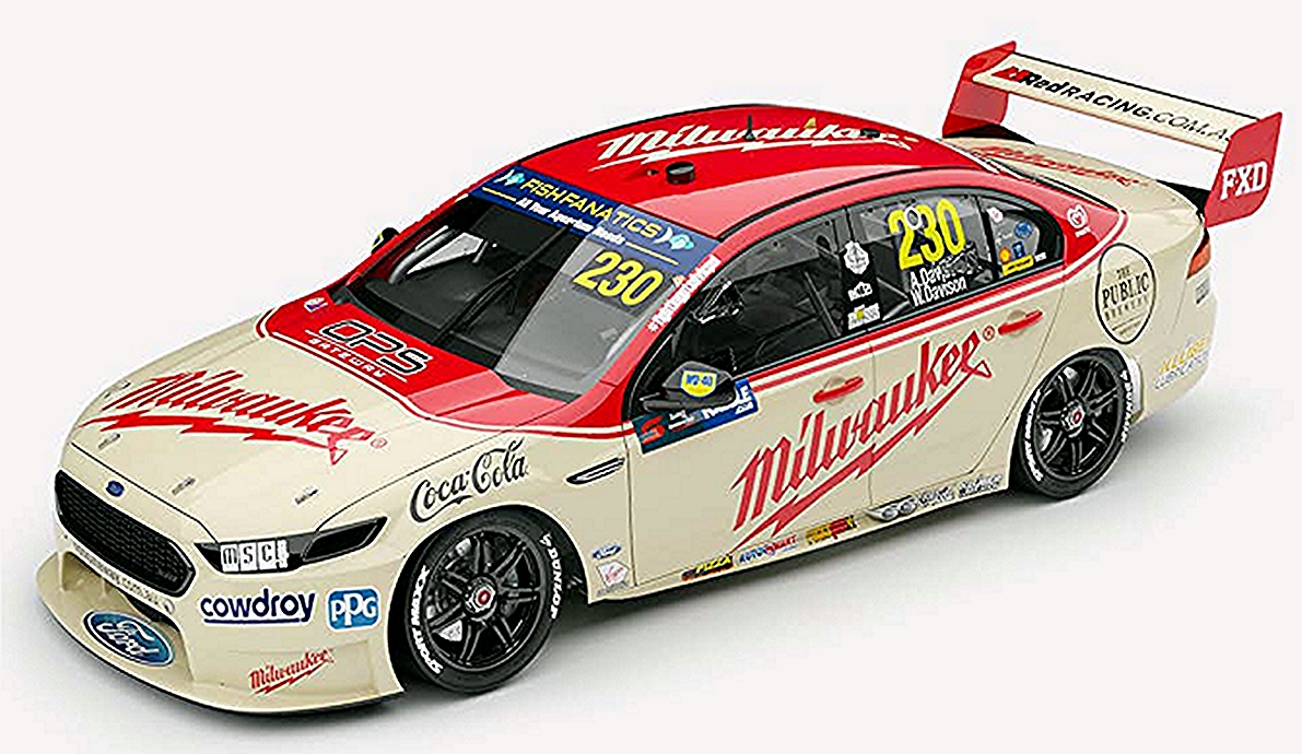 Included amongst the many awesome ‘new/old’ colour schemes that year was the Milwaukee backed Ford FGX Falcon raced by brothers Will and Alex Davison. While the livery itself wasn’t based on a previously raced car, their modern red and white season livery which featured sharper lines was replaced with a softer, cream and red bespoke decoration with retro Milwaukee branding