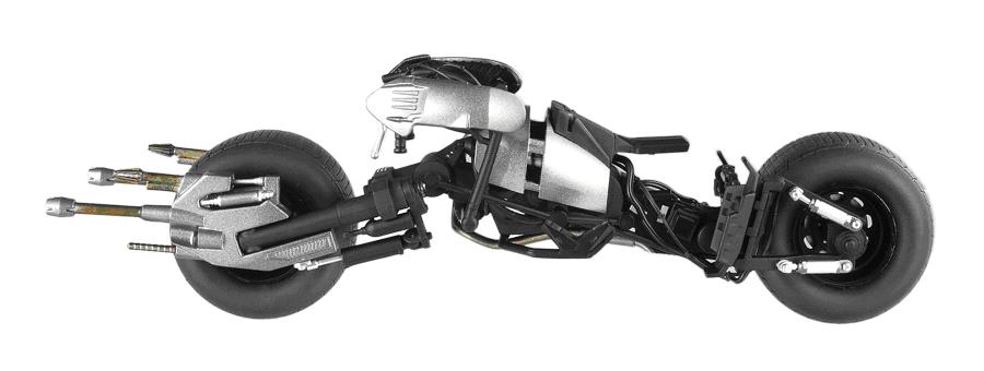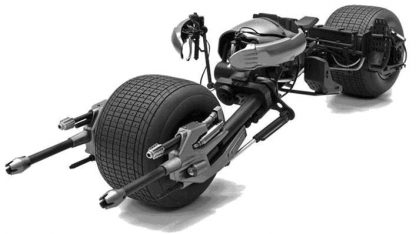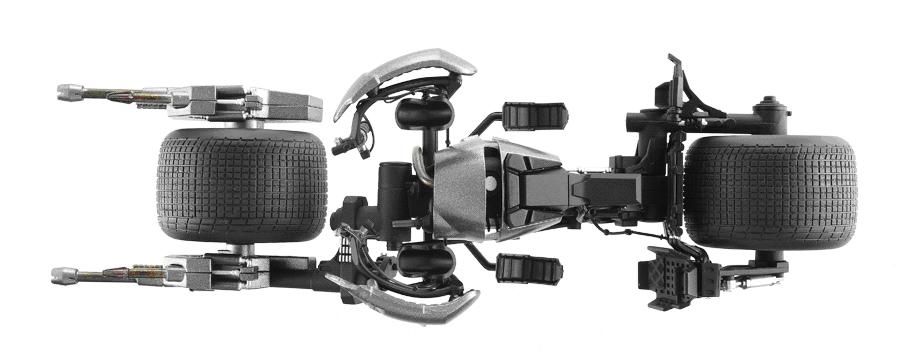 This motorcycle-ATV hybrid was custom made for THE DARK KNIGHT, fitted for ultimate protection with grappling hooks, cannons and machine guns. Equipped with a rotating saddle, the BAT-POD can maneuver under low clearances and physically elongate itself. Designed without handlebars, BATMAN steers with his shoulders, thus freeing up his hands to fight crime more effectively.