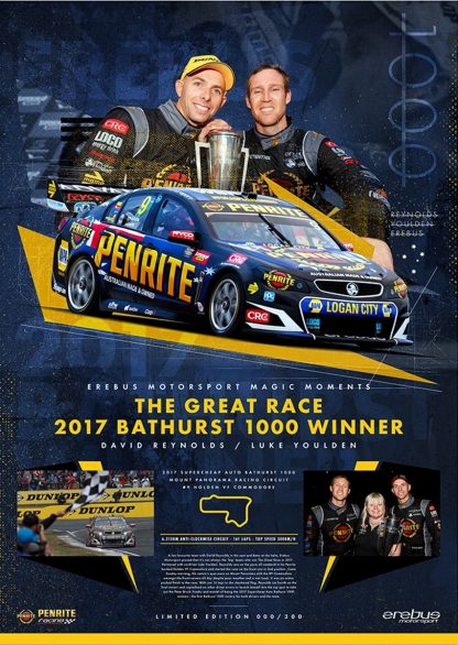 Erebus Penrite Racing Magic Moments limited edition print range which has been designed to capture key moments and milestones across the history of the team. A fan favourite team with David Reynolds in the seat and Betty at the helm, Erebus Motorsport proved that it’s not always the ‘big’ teams who win The Great Race in 2017. Partnered with co-driver Luke Youlden, Reynolds was on the pace all weekend in his Penrite backed Holden VF Commodore and started the race on the front row in 2nd position. Come Sunday morning, the nation’s eyes were on Mount Panorama with the #9 Commodore amongst the front-runners all day despite poor weather and a wet track. It was an action packed finish to the race. With just 16 laps to the checkered flag, Reynolds sat fourth on the final restart and capitalised on other driver errors to launch himself into the top spot to take out the Peter Brock Trophy and mantel of being the 2017 Supercheap Auto Bathurst 1000 winners – the first Bathurst 1000 victory for both drivers and the team.