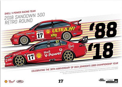 Illustrated print of the 2018 Sandown 500 Retro Round Shell V-Power Ford FGX Falcon driven by Scott McLaughlin / Alexandre Prémat and Dick Johnson’s 1988 ATCC Winning Ford Sierra RS500, celebrating the 30th Anniversary of Dick Johnson’s 1988 ATCC win.