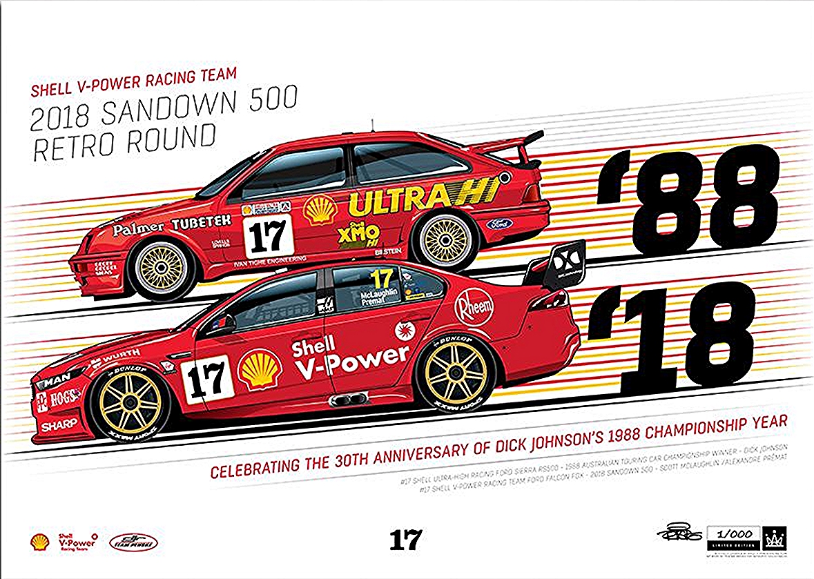 Limited edition illustrated print featuring the #17 Falcon Scott McLaughlin and Alexandre Prémat will be driving at the 2018 edition of the popular retro round along with Dick Johnson’s Championship-Winning #17 Sierra which celebrates the 30 year milestone.