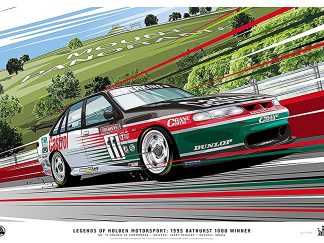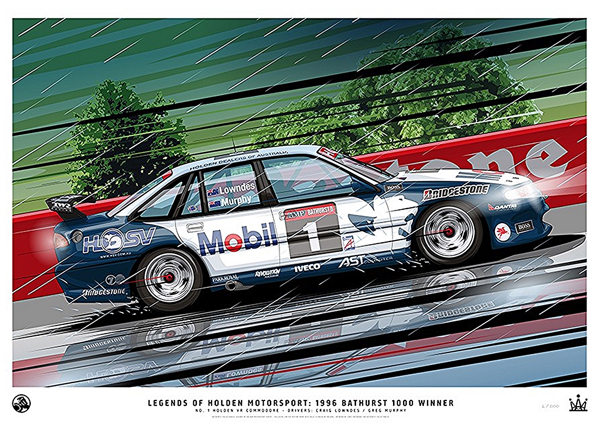 This edition features the iconic #1 Holden VR Commodore driven by Craig Lowndes and Greg Murphy to win the 1996 Bathurst 1000. This is one of the true iconic Holdens of this era. Featuring artwork by Chris Rathbone, this print depicts the Mobil backed Holden Racing Team Commodore absolutely steaming through the wet weather on its way to take out the win, the first Bathurst 1000 victory for both drivers.