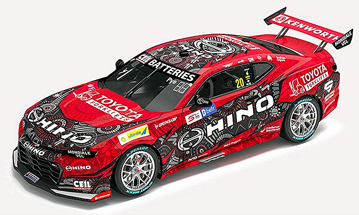 residing in Brisbane. The artwork covered the entire body of the #20 Hino backed Camaro and represented a theme of travelling on country. The predominantly red and black colour scheme with an incredible array of patterns, each with their unique meanings was bold, represented the indigenous round perfectly and was one of the best looking cars on the grid.