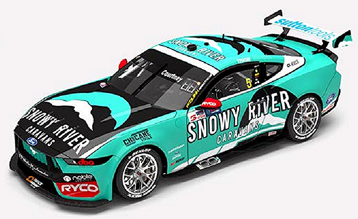 Entering his fourth season with Tickford Racing, 2010 series champion James Courtney’s #5 Snowy River Caravans backed Mustang is one of the most eyecatching cars on the grid in 2023. With this model based on the Perth SuperSprint round where he finished on the podium in race 8, Courtney’s season livery features a bright teal base with a primarily black and white colour combination on the top. It’s