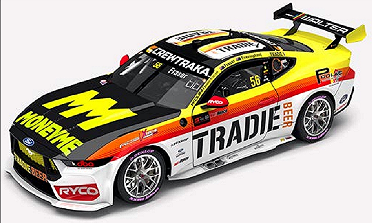 After winning the 2022 Super2 Championship, Declan Fraser joined Tickford Racing for his first season as a full time ‘main game’ driver in 2023. Racing the #56 Tradie backed Mustang across the season, Fraser teamed up with Tyler Everingham at the Bathurst 1000 where the regular black and yellow Tradie Mustang was changed up to promote Tradie Beer. The new livery had a lighter, even retro style to it,